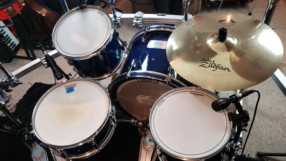 We were rehearsing for a musical production, and I was asking her about setting up a drum kit to stay at the theatre. That way, I wouldn’t have to bring my gigging kit back and forth from the theatre to a gig in between productions. If you aren’t familiar, some theatres have productions that go for several weeks or weekends, like Thursday, Friday, Saturday, with a matinee on Sunday. That’s not always the case, sometimes the Thursday show was just on the opening weekend, or the matinee was only on the closing weekend. Either way, I would have gigs during the week, and having a separate kit would make things so much easier. She told me there was a drum kit in the basement, and I could have it, so I said “Absolutely, thank you!” with the idea to turn it into a dedicated theatre kit.
