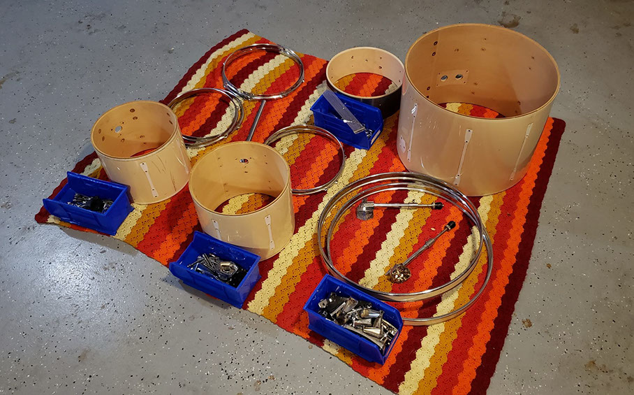 I started by disassembling all of the drums, removing the heads, hoops, lugs, the tom mounting brackets, the kick spurs, and the snare strainer, you can see the white I mentioned. After taking everything apart, I laid it all out on this fancy blanket that was shoved in the kick drum, very convenient.