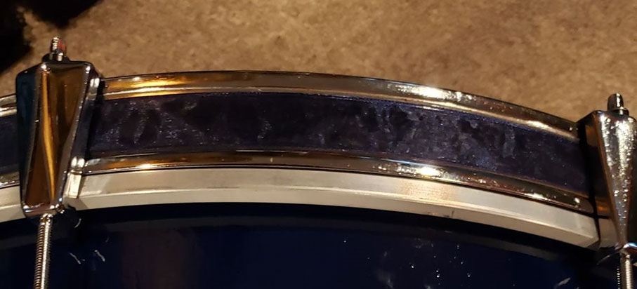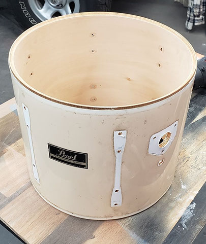 Then we inspected the shells, noting some water stains, as well as lines of glue residue from when the shell wraps were originally put on, however the shells were not warped, there were no cracks or splits, and the bearing edges were in good condition. So we sanded the shells, inside and out, with 320 grit sandpaper, nothing fancy, just a basic sanding to smooth it out. We sanded down the lines of glue residue best we could, but they were still visible, even after painting. Fortunately they aren’t very visible, and are in spots that are mostly covered by something else, like the tom mounting bracket. Sanding took about 30 minutes total.