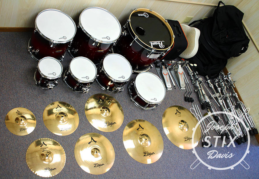Cymbals: Zildjian A Custom - 14" Mastersound Hi-Hats, 10" Splash, 15" Fast Crash, 16" Projection Crash, 18" Crash, 20" Ping Ride