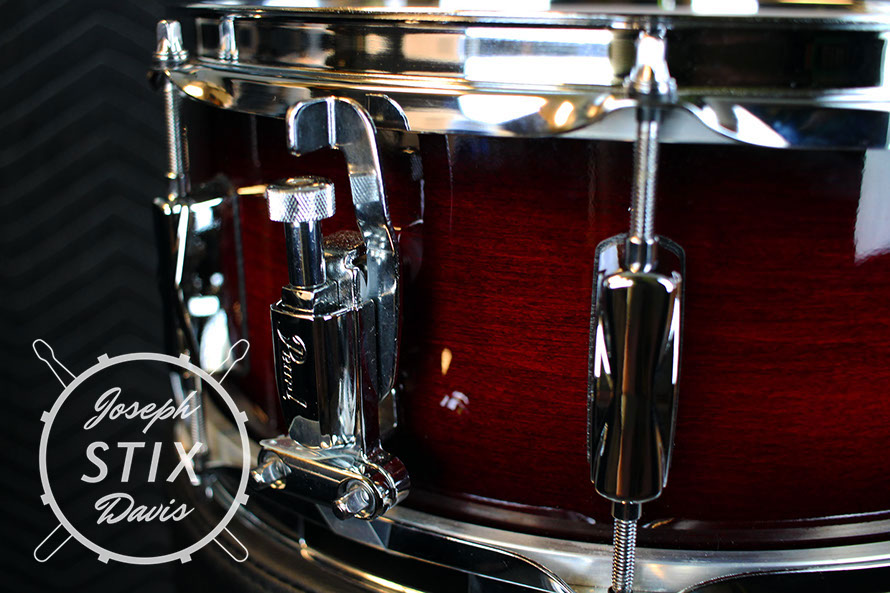 The finish for this particular snare drum is Gloss Deep Red Burst. A gorgeous vibrant dark red that fades to black. It pairs well with my black with red stripes bowling shirt.